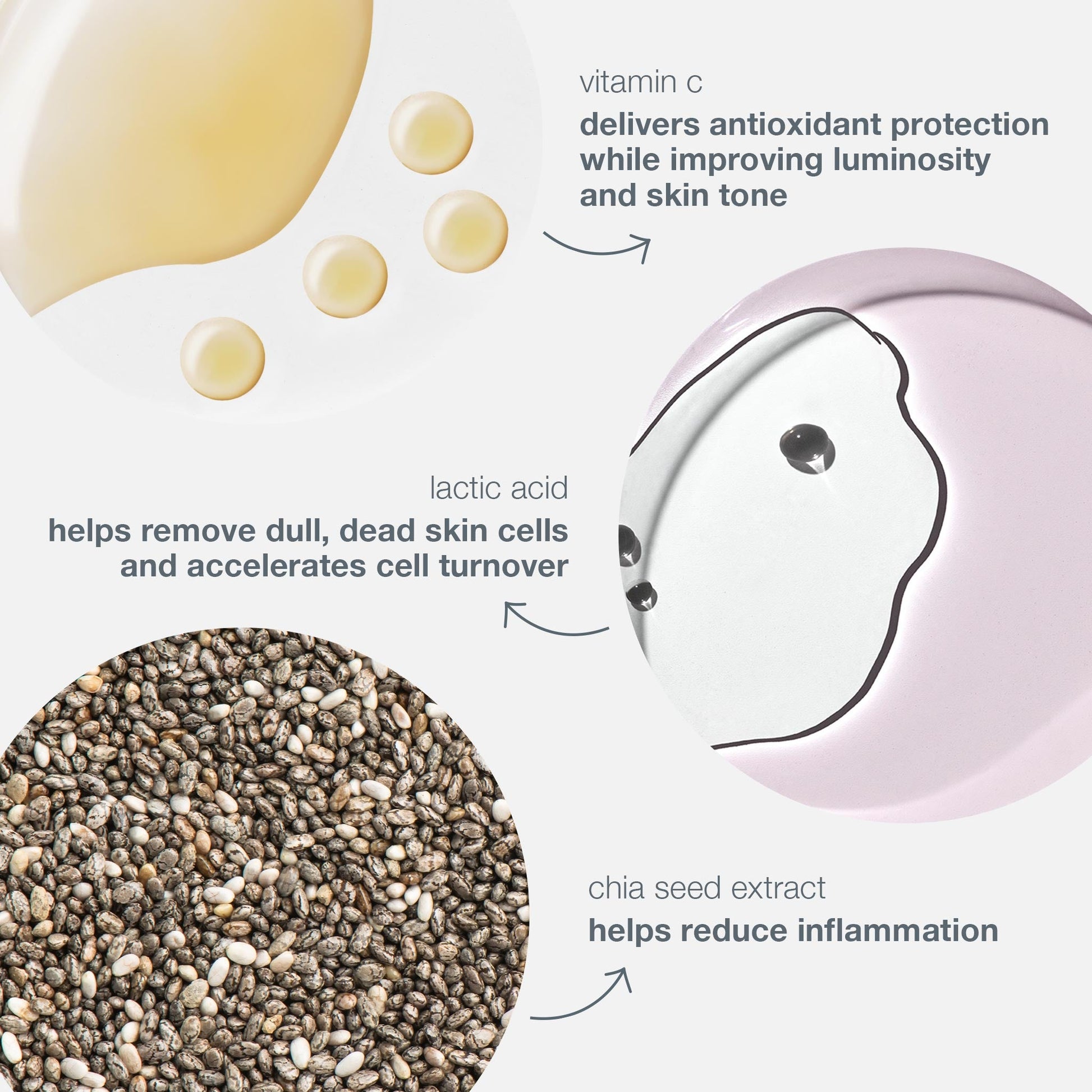 Water/ Aqua/Eau, Glycerin, Butylene Glycol, Ethoxydiglycol, Lactic Acid, Salvia Hispanica Seed Oil, Sodium PCA, Palmitoyl Tripeptide-5, Sophora Japonica Flower Extract, Ascorbyl Methylsilanol Pectinate, Sodium Hyaluronate, Tocopherol, Dipotassium Glycyrrhizate, Aminopropyl Ascorbyl Phosphate, Trehalose, Polyacrylate-13, Propanediol, Citrus Grandis (Grapefruit) Peel Oil, Helianthus Annuus (Sunflower) Seed Oil, Polyisobutene, Methylpropanediol, Carrageenan, Pentylene Glycol, Glyceryl Polyacrylate, Caprylyl Glycol, Ethylhexylglycerin, Tetrasodium Glutamate Diacetate, Xanthan Gum, Polysorbate 20, Limonene, Sodium Hydroxide, Phenoxyethanol.